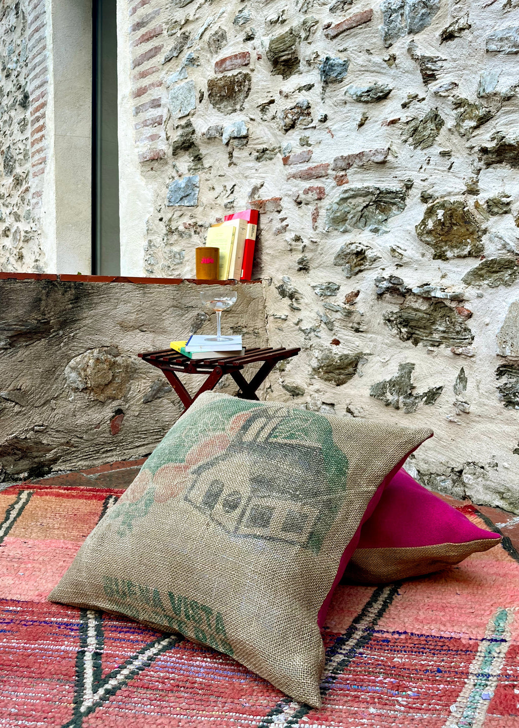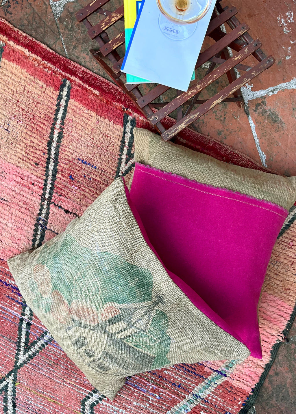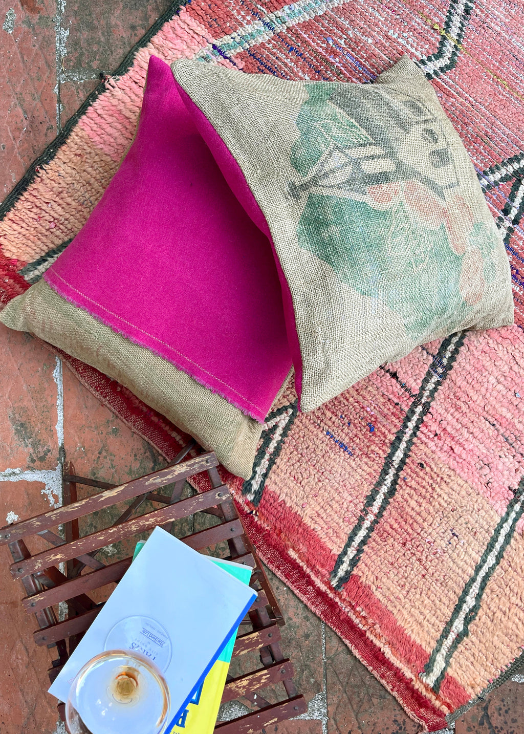 ALL GRAIN-SACKS WHERE LAUNDERED AT HIGH TEMP IN LAVENDER WATER VARIOUS TIMES FOR A SOFT RELAXED FEEL AND SHAPE. THE VINTAGE GRAPHICS CUT TO A 50CM (20IN) SQUARE, AND THE REST USED TO CREATE DEEP FLAPPED POCKET ENCLOSURE.