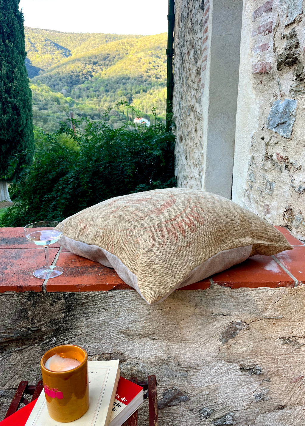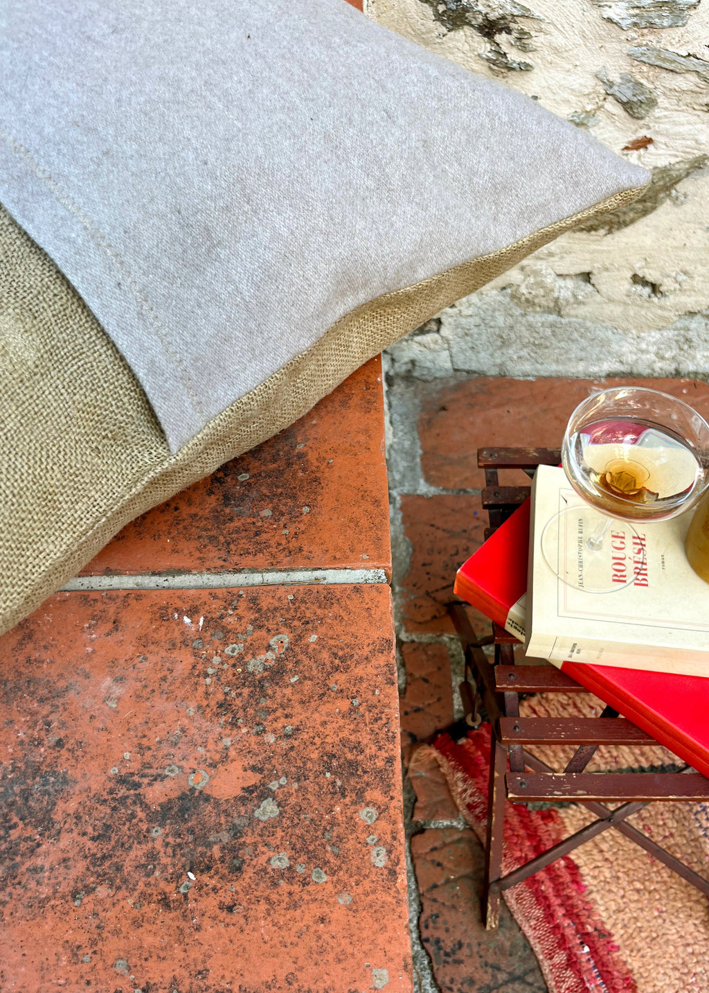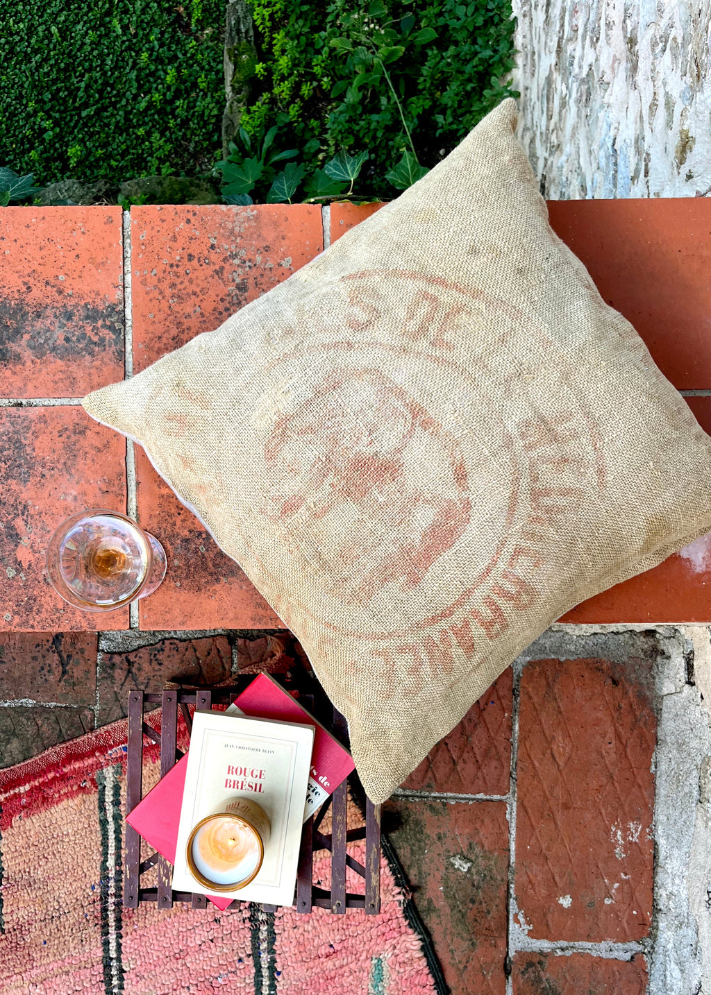 ALL GRAIN-SACKS WHERE LAUNDERED AT HIGH TEMP IN LAVENDER WATER VARIOUS TIMES FOR A SOFT RELAXED FEEL AND SHAPE. THE VINTAGE GRAPHIC CUT TO A 50CM (20IN) SQUARE, AND THE REST USED TO CREATE DEEP FLAPPED POCKET ENCLOSURE.